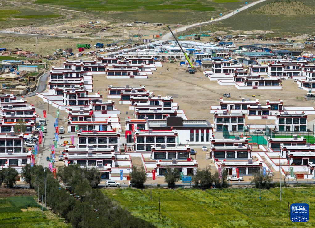 8月15日在西藏定日县森嘎村拍摄的“定日6.8级地震灾后恢复重建民房首批入住仪式”(无人机拼接照片)。新华社记者 姜帆 摄