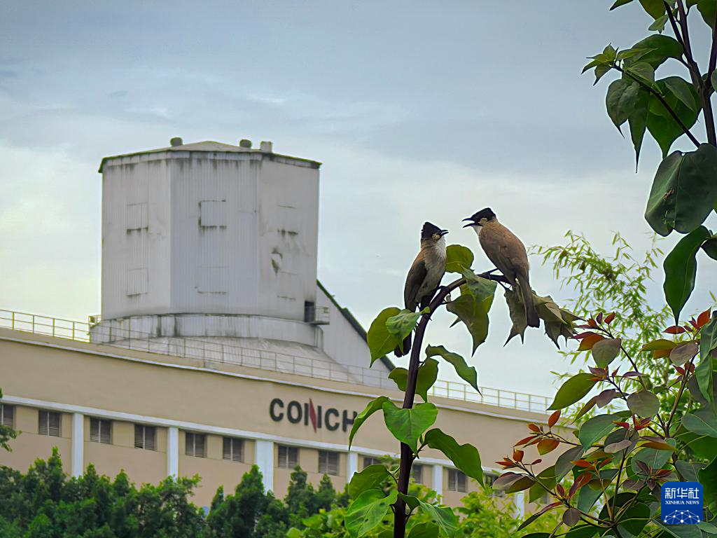 8月15日,在重庆市忠县的重庆海螺水泥有限责任公司,一对黄臀鹎在厂区内的绿植上嬉戏。新华社记者 唐奕 摄