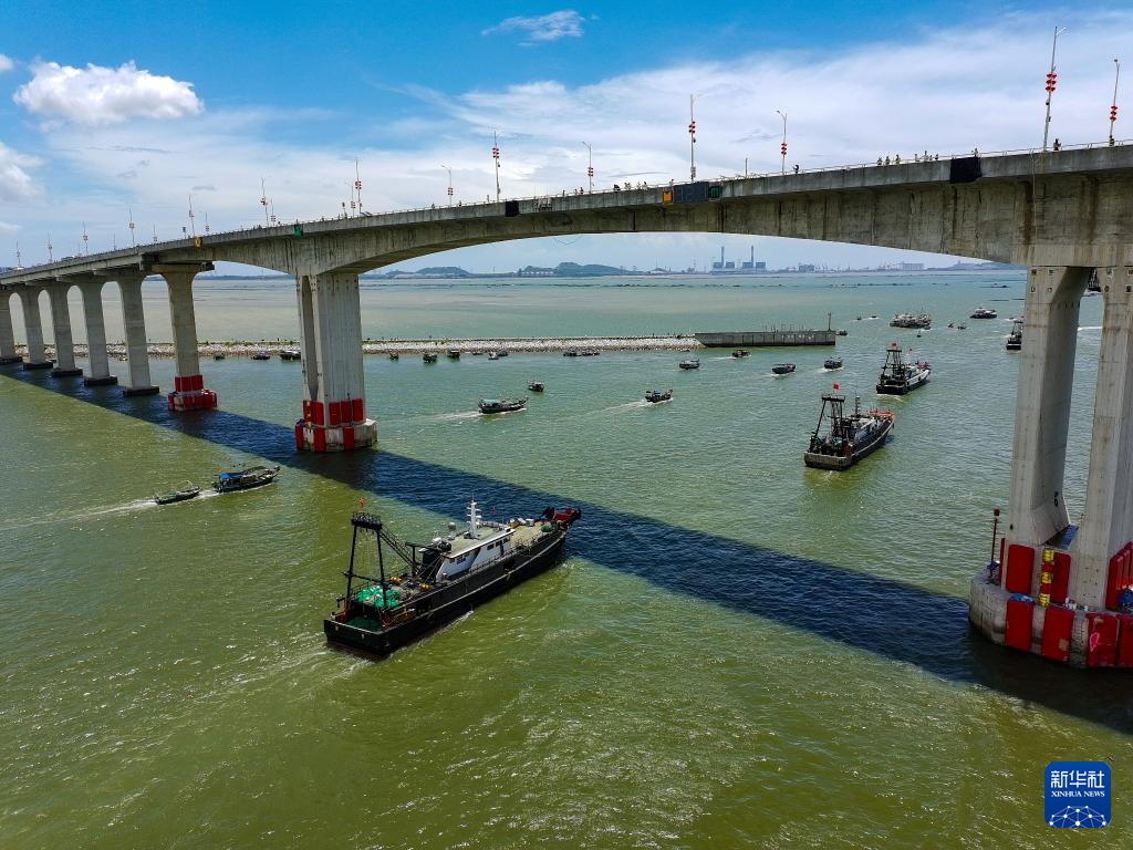 8月16日,出港的渔船驶过博贺湾大桥(无人机照片)。新华社记者 肖恩楠 摄