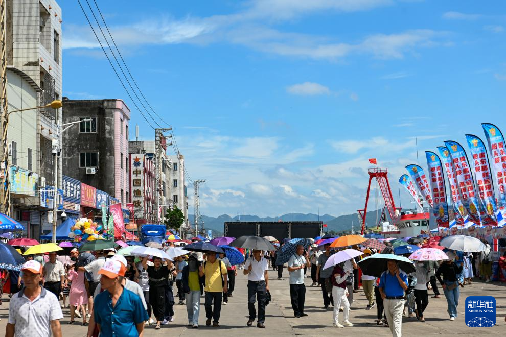 8月16日,游客来到博贺渔港观看开渔活动。新华社记者 肖恩楠 摄