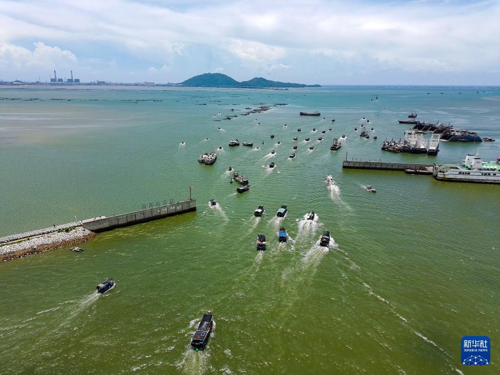8月16日,渔船驶出博贺渔港开始捕捞作业(无人机照片)。新华社记者 肖恩楠 摄