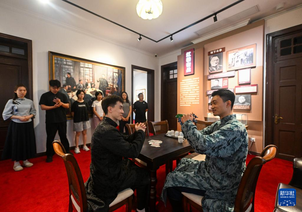 演员在吉鸿昌旧居实景演绎“光荣入党”片段(8月16日摄)。新华社记者 赵子硕 摄