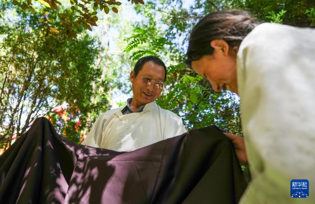 洛桑麦朗(左)在学校和学徒一起查验成品藏装品质(8月15日摄)。新华社记者 晋美多吉 摄