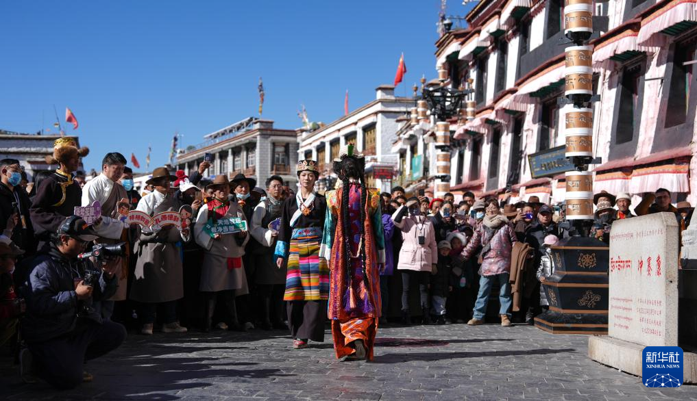 模特在拉萨八廓街“繁饰自然·衣彩拉萨——拉萨新年服饰秀”活动中巡游(1月3日摄)。新华社记者 晋美多吉 摄
