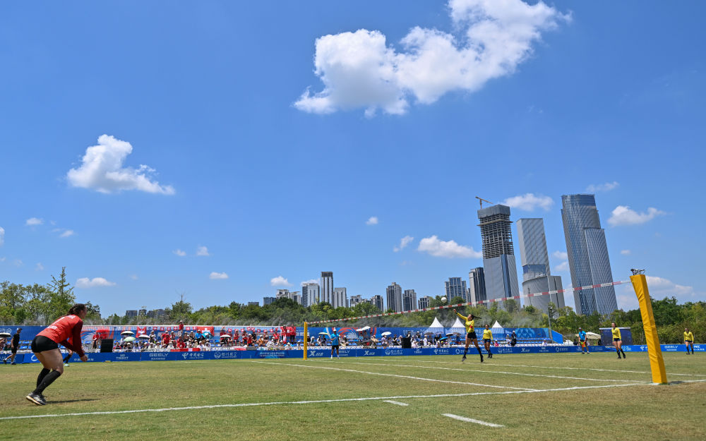 回望赛事中的兴隆湖,湖面上龙舟竞速,沙滩上手球飞跃。本届世运会的15个室外场地,或依托于户外公园、公开水域等改建临设,或设在草地、沙滩等自然场地,生动诠释“体育赛事”与“公园城市”的完美融合。