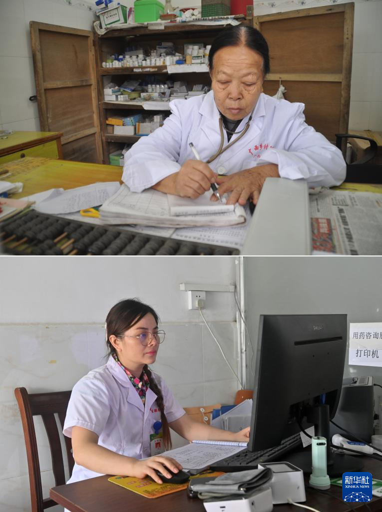这是一张拼版照片。上图:杜桂梅医生在高岭村卫生室为病人手写处方(2011年12月7日摄)。下图:潘雪梅医生在高岭村卫生室用电脑录入病人信息(2025年8月18日摄)。新华社记者 陆波岸 摄
