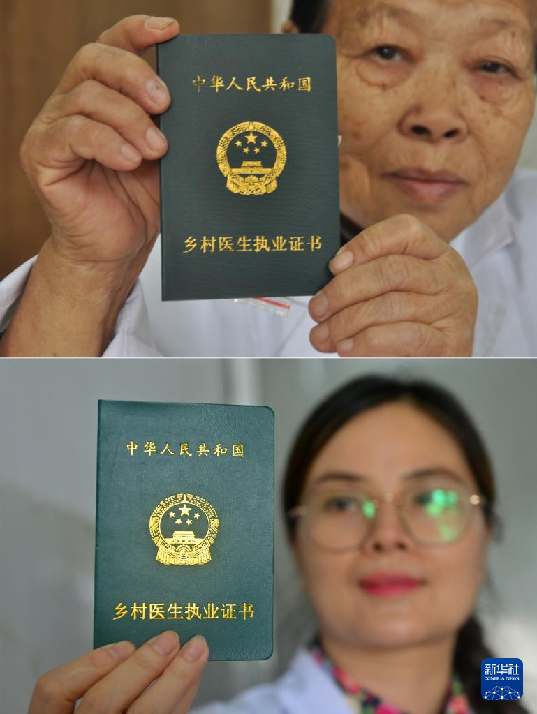 这是一张拼版照片。上图:杜桂梅医生在高岭村卫生室展示自己的乡村医生执业证书(2011年12月7日摄)。下图:潘雪梅医生在高岭村卫生室展示自己的乡村医生执业证书(2025年8月18日摄)。新华社记者 陆波岸 摄