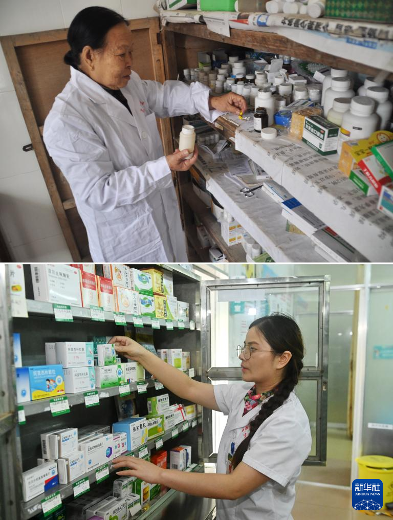 这是一张拼版照片。上图:杜桂梅医生在高岭村卫生室为病人配药(2011年12月7日摄)。下图:潘雪梅医生在高岭村卫生室为病人找药品(2025年8月18日摄)。新华社记者 陆波岸 摄