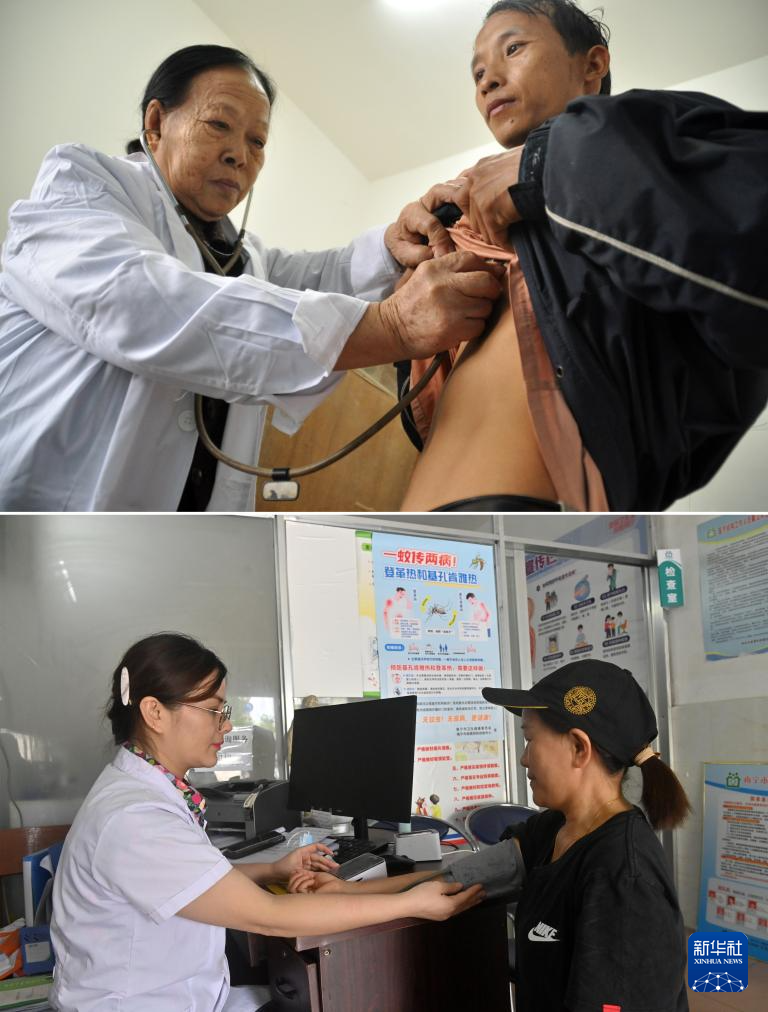 这是一张拼版照片。上图:杜桂梅医生(左)在高岭村卫生室为村民检查身体(2011年12月7日摄)。下图:潘雪梅医生(左)在高岭村卫生室给村民测量血压(2025年8月18日摄)。新华社记者 陆波岸 摄