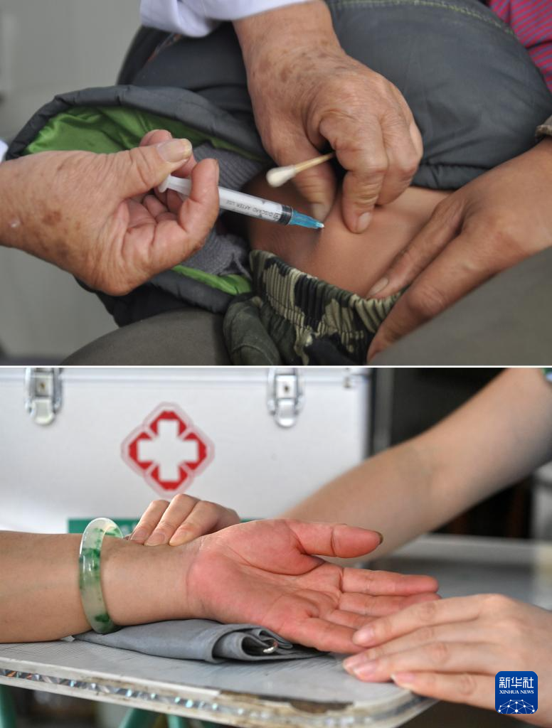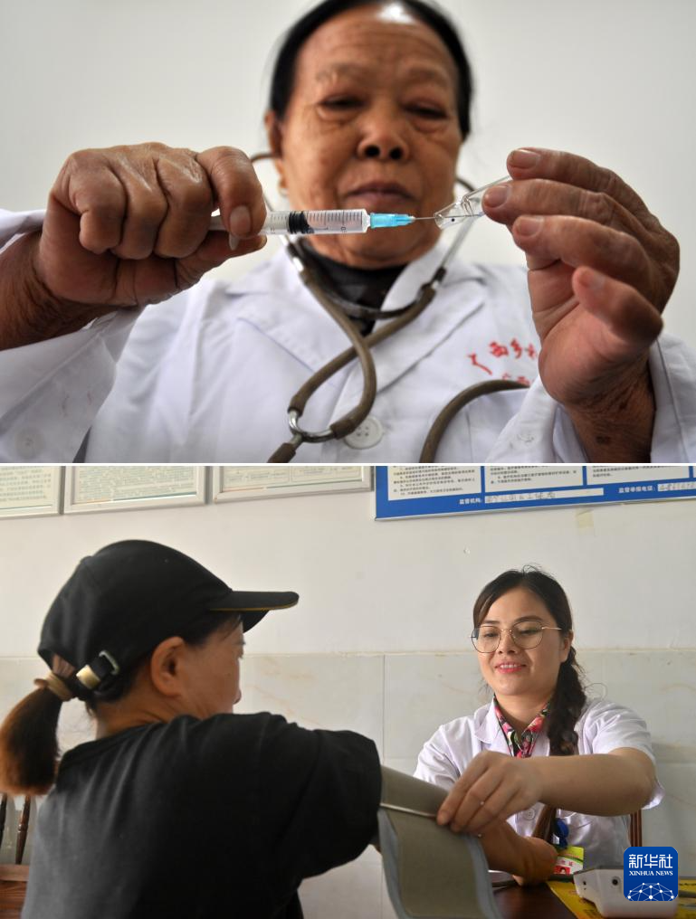 这是一张拼版照片。上图:杜桂梅医生在高岭村卫生室给村民打针(2011年12月7日摄)。下图:潘雪梅医生在高岭村卫生室为村民把脉看病(2025年8月18日摄)。新华社记者 陆波岸 摄