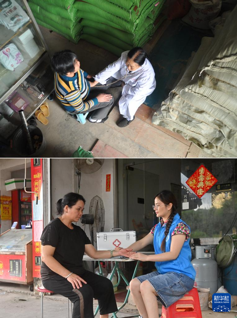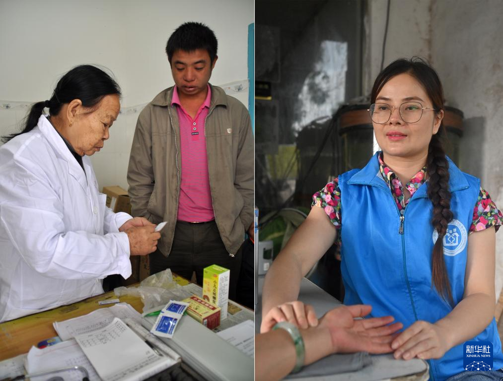 这是一张拼版照片。左图:在高岭村卫生室,杜桂梅医生向村民交代用药注意事项(2011年12月7日摄)。右图:潘雪梅医生入户为村民把脉看病(2025年8月18日摄)。新华社记者 陆波岸 摄