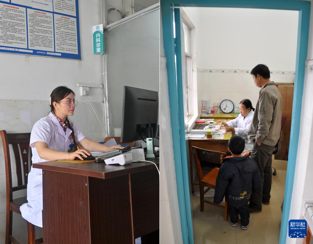 这是一张拼版照片。左图:在高岭村卫生室,潘雪梅医生通过电脑查阅村民就医信息(2025年8月18日摄)。右图:杜桂梅医生向村民交代用药注意事项(2011年12月7日摄)。新华社记者 陆波岸 摄