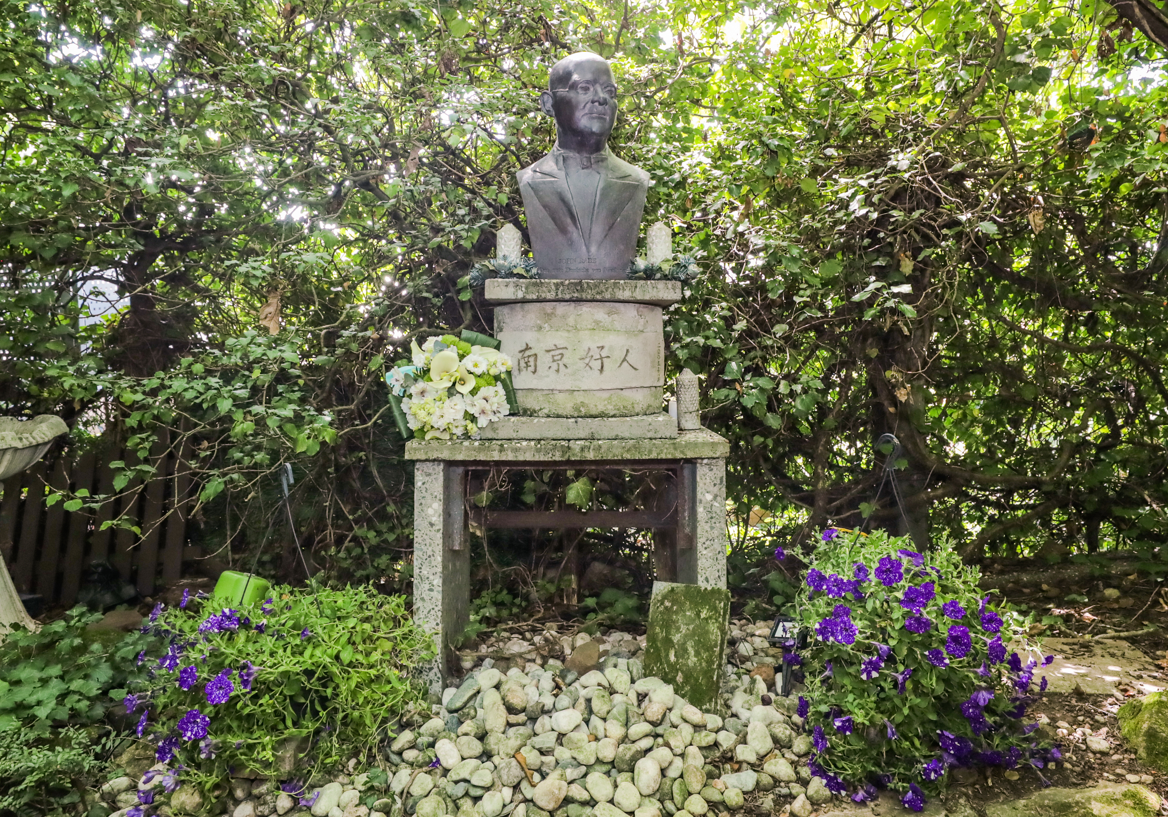 1950年,拉贝逝世,被安葬在柏林西郊。墓碑周围是从南京移栽而来的竹子、梅花和菊花。基座前铺有雨花石。墓碑前方矗立着拉贝半身雕像,其下立有纪念碑,用中德双语镌刻着:“感恩——永远铭记拉贝先生的国际人道主义善举!中国·南京。”墓前摆放着凭吊者送上的簇簇鲜花。