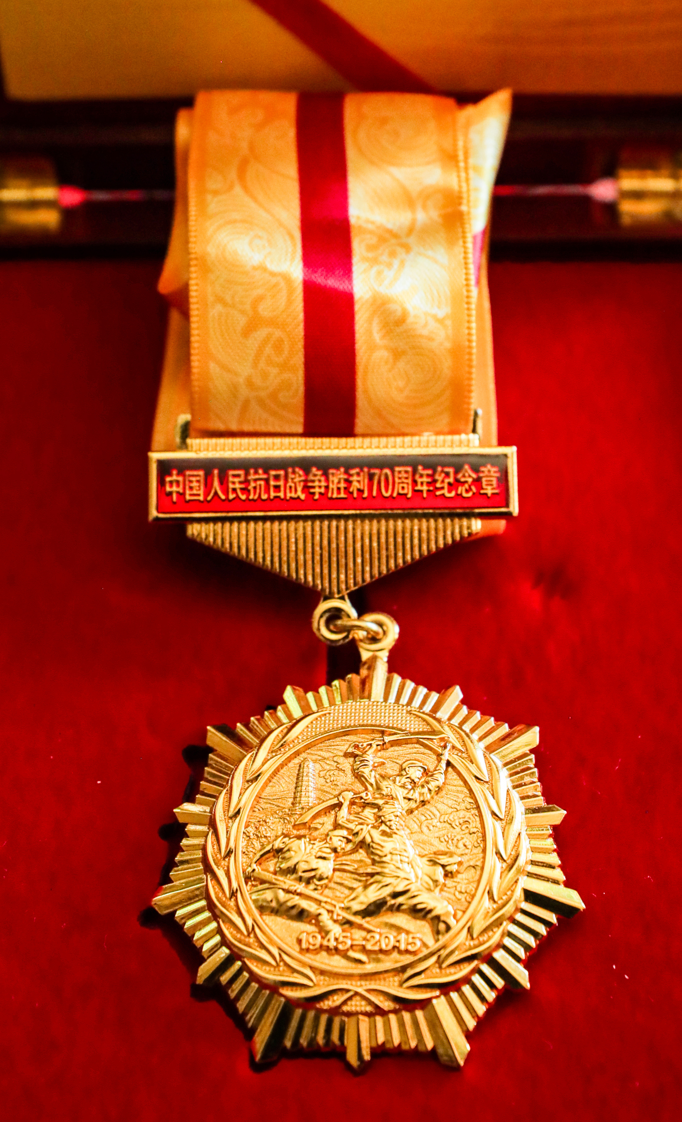 这是8月7日在德国海德堡约翰·拉贝交流中心拍摄的“中国人民抗日战争胜利70周年”纪念章。新华社记者 张帆 摄