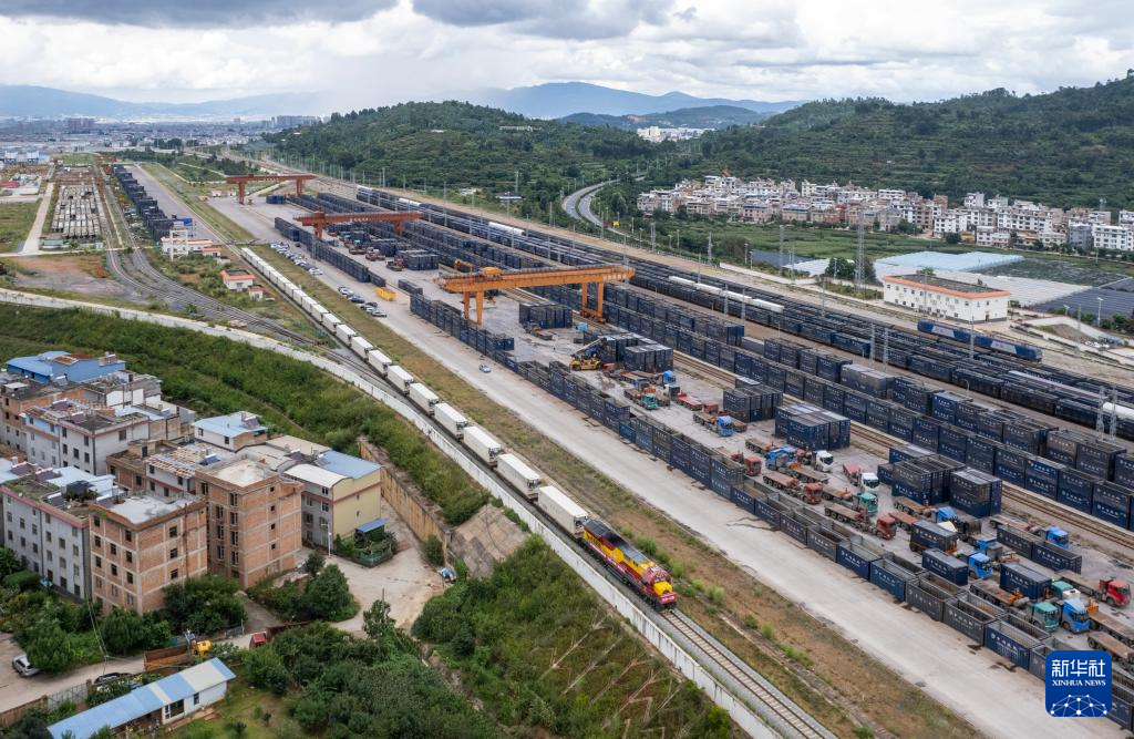8月23日,前往老挝万象的国际货物列车驶出中老铁路玉溪研和站(无人机照片)。新华社记者 陈欣波 摄