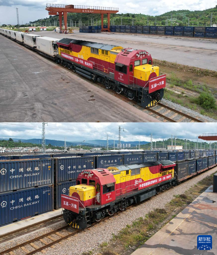 拼版照片:上图是8月23日在中老铁路玉溪研和站拍摄的准备发车前往老挝万象的国际货物列车(无人机照片);下图是8月23日拍摄的从老挝万象发车并已抵达中老铁路玉溪研和站的国际货物列车(无人机照片)。新华社记者 陈欣波 摄