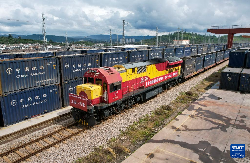 8月23日,前往老挝万象的国际货物列车驶出中老铁路玉溪研和站。新华社记者 陈欣波 摄