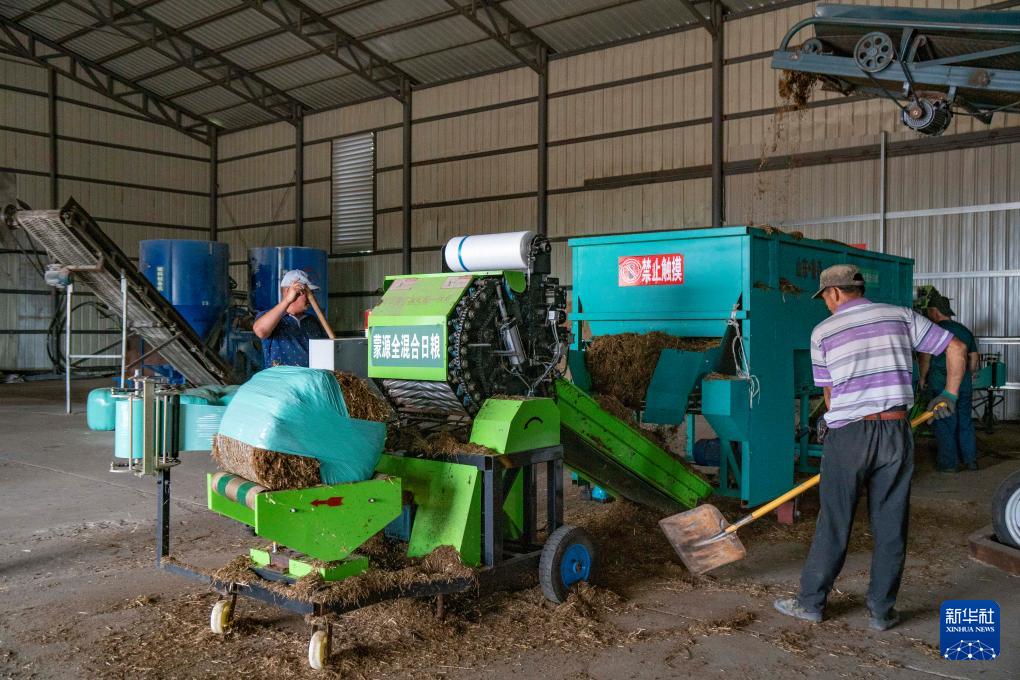 8月1日,蒙源农牧业集团有限公司工人在加工打包全混合日粮。新华社记者 丁赫 摄