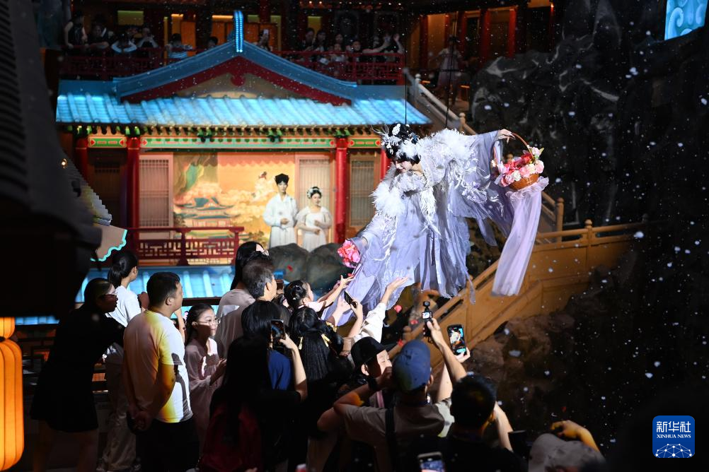 8月22日,在位于厦门东渡邮轮母港片区的闽南文化主题景区“屿见闽南·时光幻境”,“白鹭女神”与观众互动。新华社记者 肖潇 摄