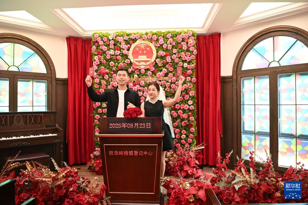 8月23日,一对新人在鼓浪屿婚姻登记中心拍照留念。新华社记者 肖潇 摄