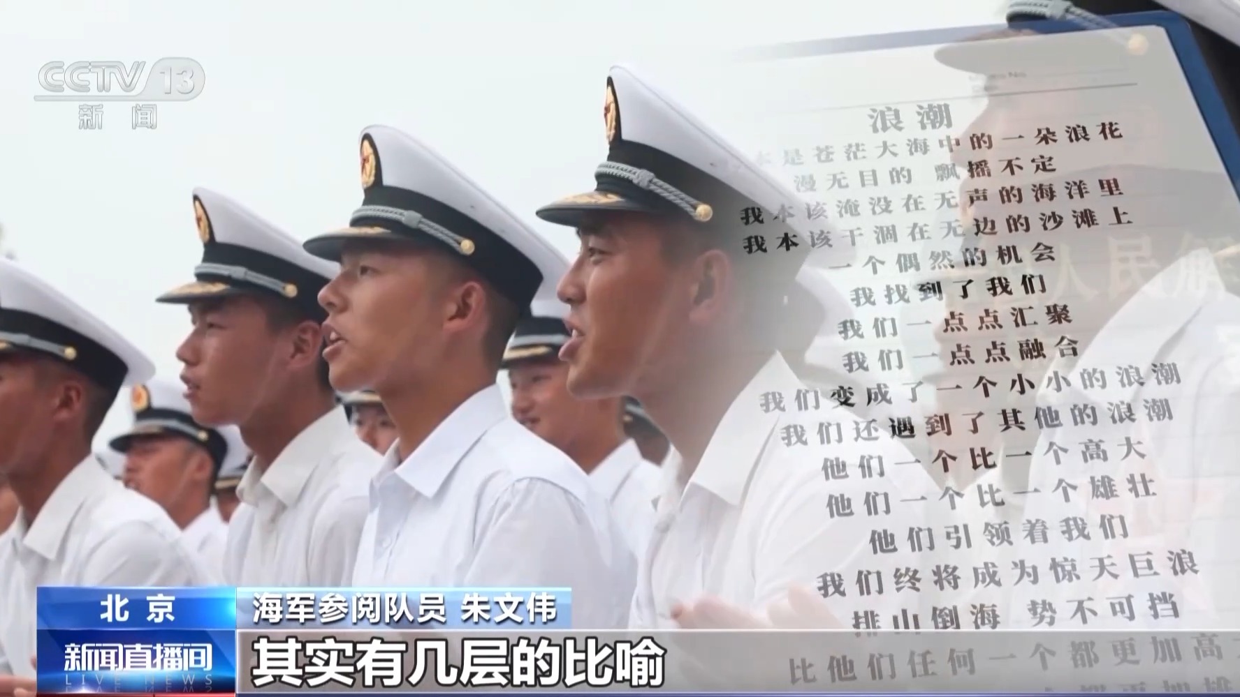 海军参阅队员 朱文伟:我在诗中写道,我们遇到了其他的浪潮,他们一个比一个高大,一个比一个雄壮,这里的其他浪潮。其实有几层的比喻,其中一层就是曾经受阅过的,我们海军的先辈们,他们也是引领着我们浪潮,但是我的诗里又写了,我们终将成为惊天巨浪,排山倒海,势不可挡。
