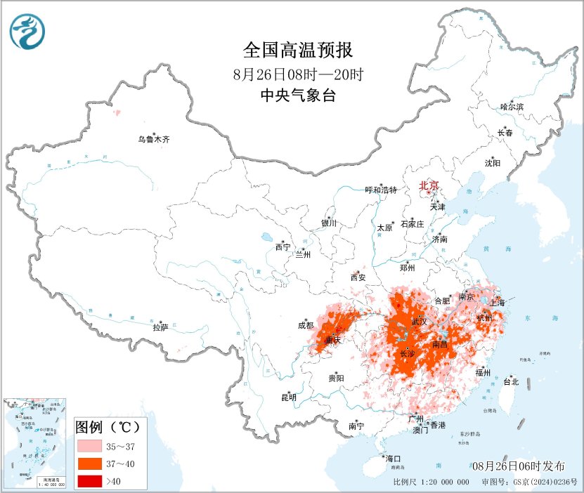 预计8月26日白天,四川东部、重庆、河南南部、湖北大部、湖南、江西、安徽中南部、江苏南部、浙江、上海、福建大部、广东北部、广西北部以及新疆吐鲁番盆地等地有35~39℃高温天气,其中,重庆中西部、湖北西南部、湖南东北部、江西北部、浙江中西部等地局地最高气温可超过40℃。中央气象台8月26日06时继续发布高温黄色预警。