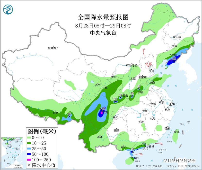 8月27日08时至28日08时,内蒙古中东部、辽宁中南部、青海东部和南部、甘肃南部、宁夏、陕西北部、山西中北部、京津冀、四川盆地西部、川西高原北部、云南南部、广西西南部、海南岛等地有中到大雨,其中,辽宁西南部、河北中北部、北京、天津、四川盆地西部、甘肃西南部等地的部分地区有暴雨或大暴雨(100~200毫米)。内蒙古中部、辽东半岛、山东半岛等地的部分地区有4~5级风。渤海有5~7级、阵风8级的偏东风,南海东北部海域有6~7级、阵风8级的偏东风,南海东南部海域有5~7级、阵风8级的偏西风。