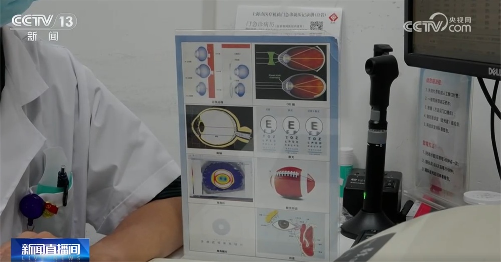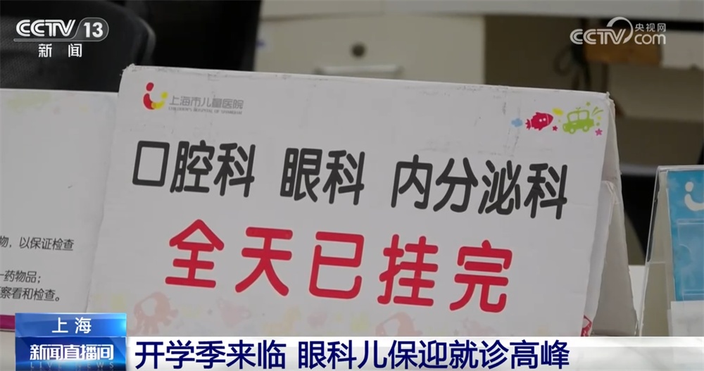 8月23日上午10点,上海市儿童医院预检台摆出多个科室号源已满的告示牌。在眼科,等待视力检查的队伍排起长龙,配镜区也是人头攒动。