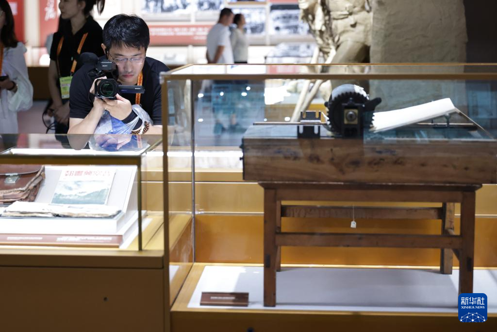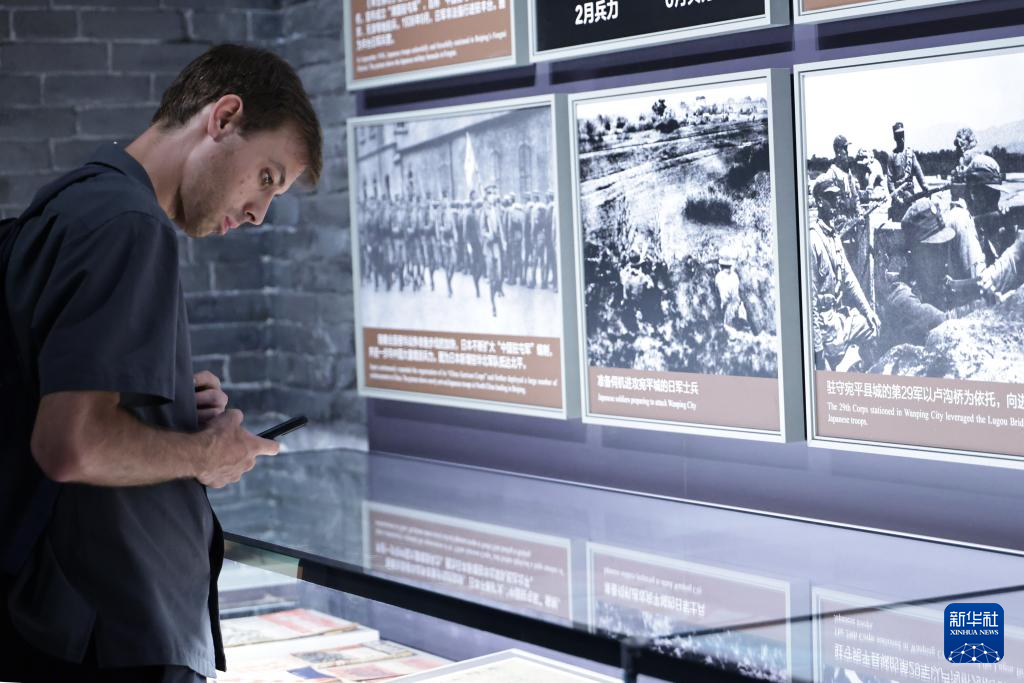 8月27日,一名记者在中国人民抗日战争纪念馆内采访。新华社记者 张玉薇 摄