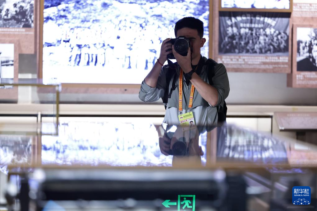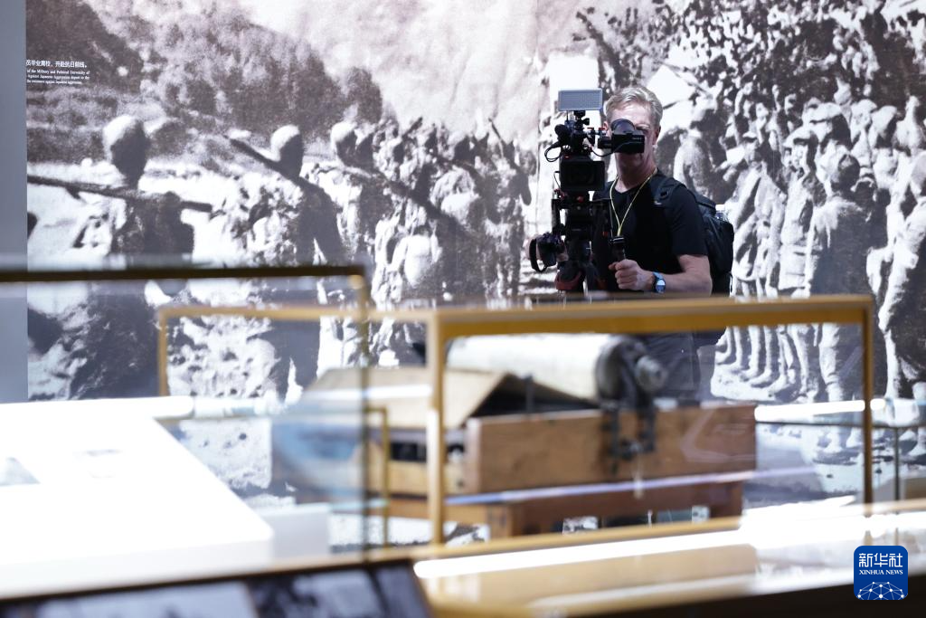 8月27日,中外媒体记者在中国人民抗日战争纪念馆内采访。新华社记者 张玉薇 摄