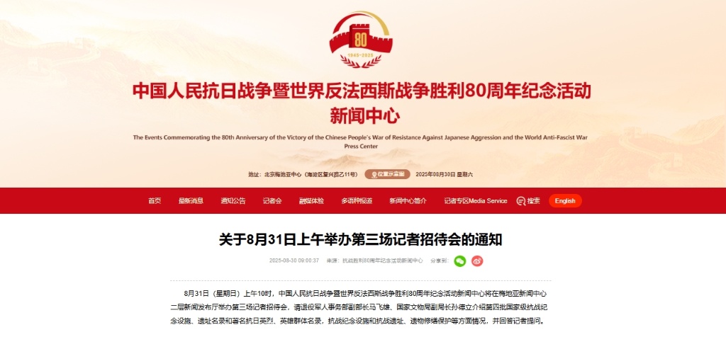 8月31日(星期日)上午10时,中国人民抗日战争暨世界反法西斯战争胜利80周年纪念活动新闻中心将在梅地亚新闻中心二层新闻发布厅举办第三场记者招待会,请退役军人事务部副部长马飞雄、国家文物局副局长孙德立介绍第四批国家级抗战纪念设施、遗址名录和著名抗日英烈、英雄群体名录,抗战纪念设施和抗战遗址、遗物修缮保护等方面情况,并回答记者提问。(记者朱高祥)