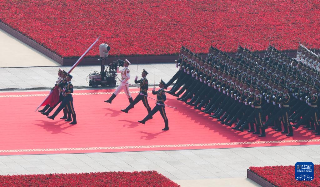 9月3日,纪念中国人民抗日战争暨世界反法西斯战争胜利80周年大会在北京隆重举行。这是国旗护卫队官兵护卫着五星红旗,从人民英雄纪念碑行进至广场北侧升旗区。