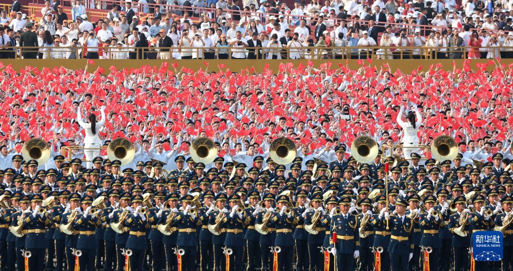 9月3日,纪念中国人民抗日战争暨世界反法西斯战争胜利80周年大会在北京隆重举行。这是中国人民解放军联合军乐团在演奏。