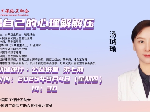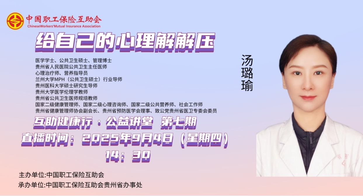直播回顾|“互助健康行·公益讲堂”2025年第七期——给自己的心理解解压 亲爱的职工朋友们,是否有时候被工作压得喘不过气?有没有被焦虑缠得夜不能寐?别让压力成为生活的“隐形负担”!这场“给自己的心理解解压”科普讲座,带您拆解压力密码,学会给情绪松绑,用科学方法帮您读懂压力、对抗压力,解锁更从容的生活方式!2025年9月4日(周四)下午14:30至16:00,由中国职工保险互助会主办、中互会贵州省办事处承办的2025年第七期“互助健康行·公益讲堂”——《给自己的心理解解压》,开启线上直播。本期“互助健康行·公益讲堂”线上直播活动邀请了医学学士、公共卫生硕士、管理博士,贵州省人民医院公共卫生主任医师、心理治疗师、营养指导员,兰州大学MPH(公共卫生硕士)行业导师,贵州医科大学硕士研究生导师,贵州大学医学伦理学教师,贵州省公共卫生医师规培教师,国家二级健康管理师、国家二级心理咨询师、国家二级公共营养师、社会工作师,贵州省健康管理师协会副会长,贵州省预防医学会理事、致公党贵州省医卫专委会委员汤璐瑜老师,和职工会员们聊一聊如何多途径通过科学有效的方式降低心理压力,学习实用心理调节技巧,让心理能量做到“待机一整天”。中工网首页、微博、视频号同步播出,欢迎广大职工网友在线收看直播!