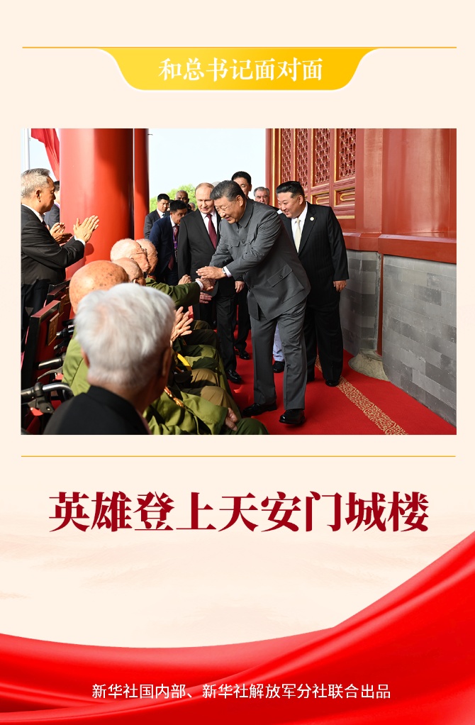纪念中国人民抗日战争暨世界反法西斯战争胜利80周年大会开始前,习近平总书记登上城楼,走到抗战老战士老同志面前俯下身来,双手紧紧握住他们的手,目光深情而温暖。