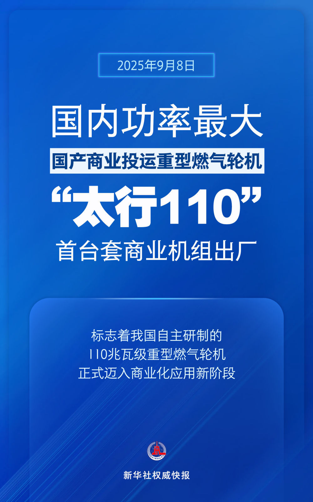 9月8日,国内功率最大的国产商业投运重型燃气轮机“太行110”首台套商业机组在中国航发燃机制造装试基地出厂,标志着我国自主研制的110兆瓦级重型燃气轮机正式迈入商业化应用新阶段。