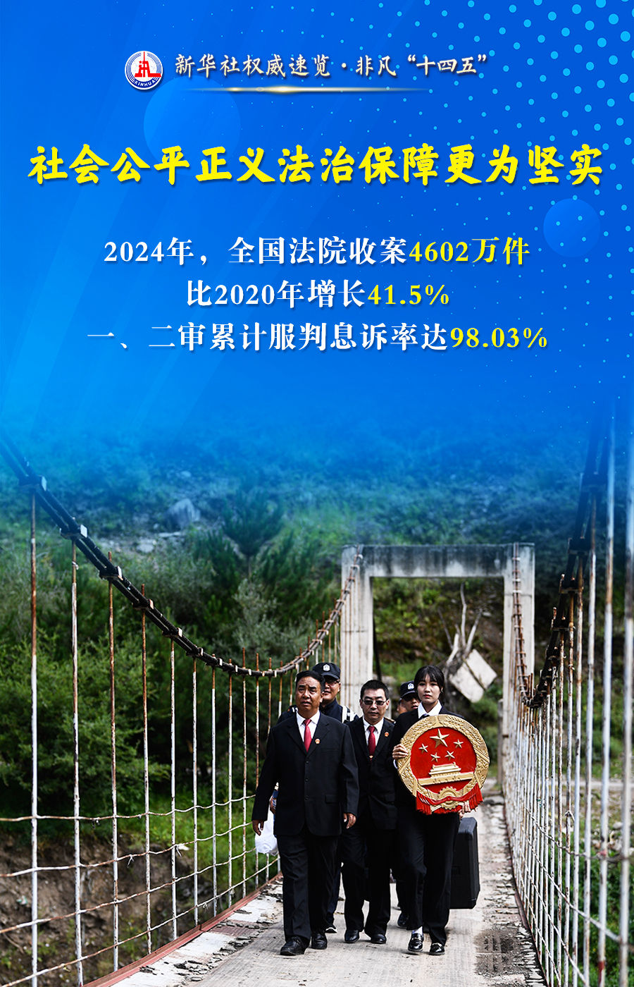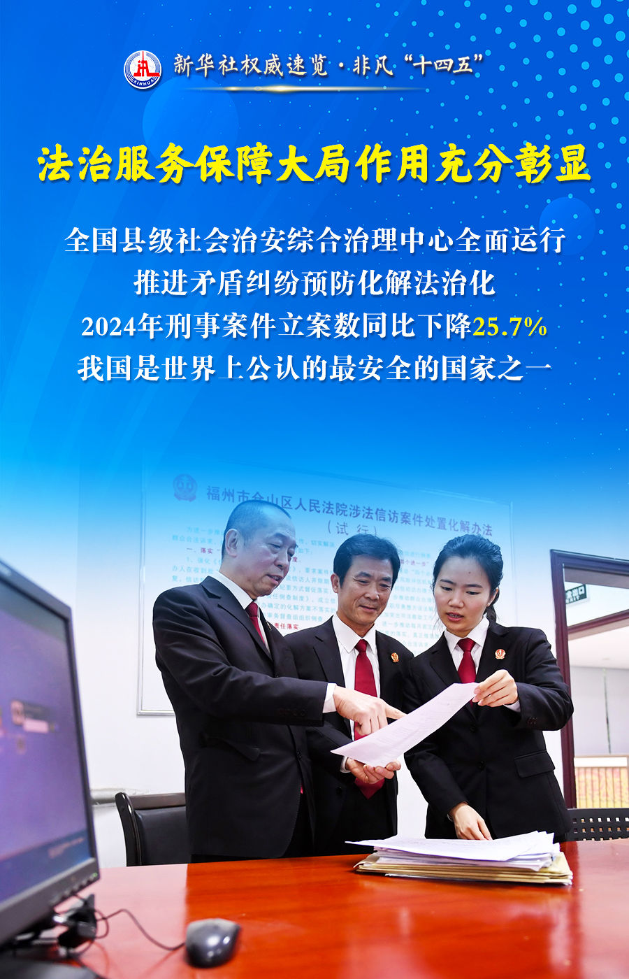 法治是中国式现代化的重要保障。在12日举行的“高质量完成‘十四五’规划”发布会上,中央政法委秘书长訚柏说,“十四五”期间,法治中国建设取得突破性进展、历史性成就,为书写经济快速发展和社会长期稳定“两大奇迹”新篇章提供了有力保障,具体体现在五个方面。让我们跟随海报,共同了解。