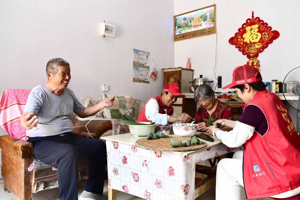 2025年5月28日,在山东省菏泽市郓城县郓州街道大樊庄村,居家养老服务中心的工作人员上门为建档立卡特困老人樊西见(左一)、侯爱菊服务。新华社记者 郭绪雷 摄