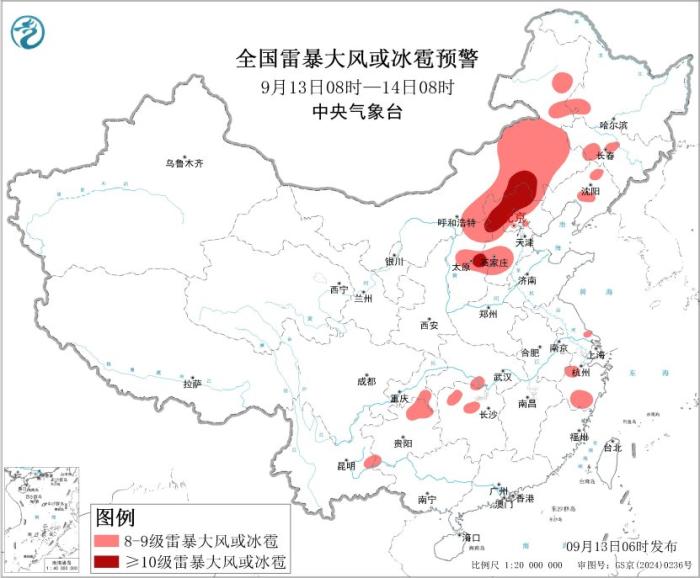 预计,未来两天,内蒙古、华北及东北地区等地有强对流天气。其中,9月13日08时至14日08时,内蒙古中东部、华北中北部、江南北部等地的部分地区将有8级以上雷暴大风或冰雹天气,其中,内蒙古中部、河北北部、山西中部等地的部分地区将有10级以上雷暴大风。中央气象台9月13日06时继续发布强对流天气蓝色预警。