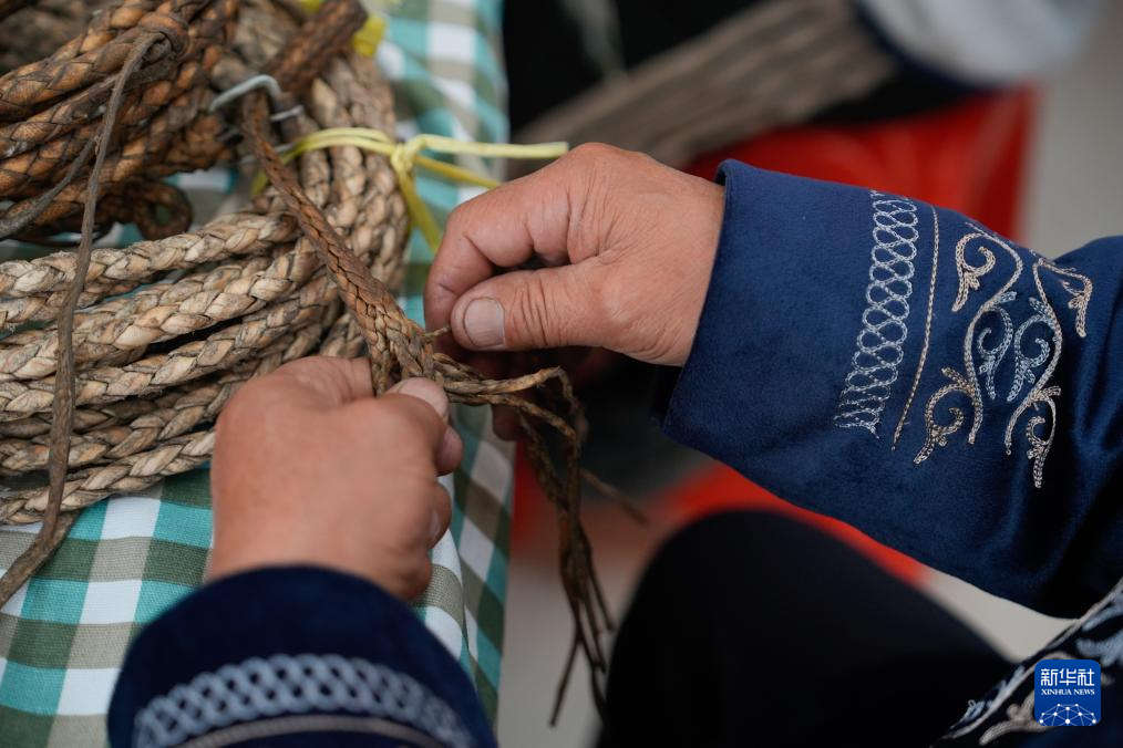 9月13日,在额敏县记忆馆,一名手工艺人在编织马鞭。新华社记者 张浩波 摄