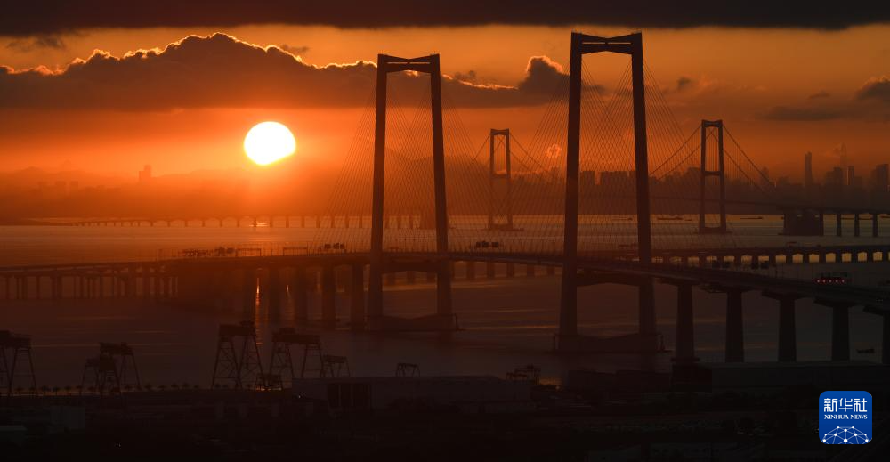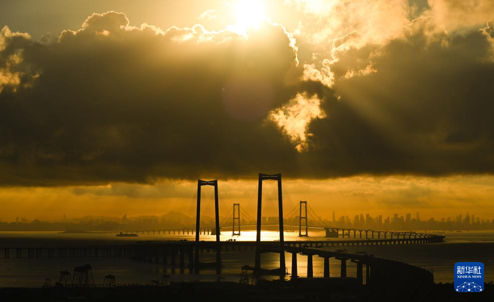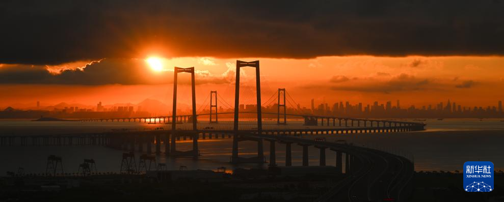 9月14日,深中通道与初升的朝阳交相辉映。新华社记者 邓华 摄