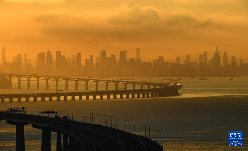 9月14日拍摄的沐浴在晨曦之中的深中通道与远处的深圳市区。新华社记者 邓华 摄