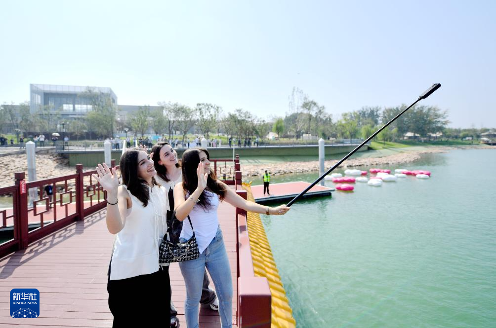 9月14日,外国游客在石家庄市元氏县蟠龙湖景区拍照留念。新华社记者 王晓 摄