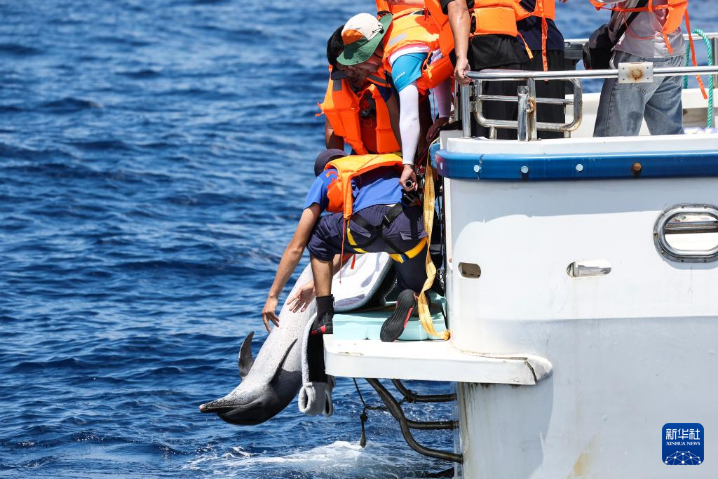 9月14日,在海南万宁一处海域,救助人员准备放归海豚“万万”。新华社记者 张丽芸 摄