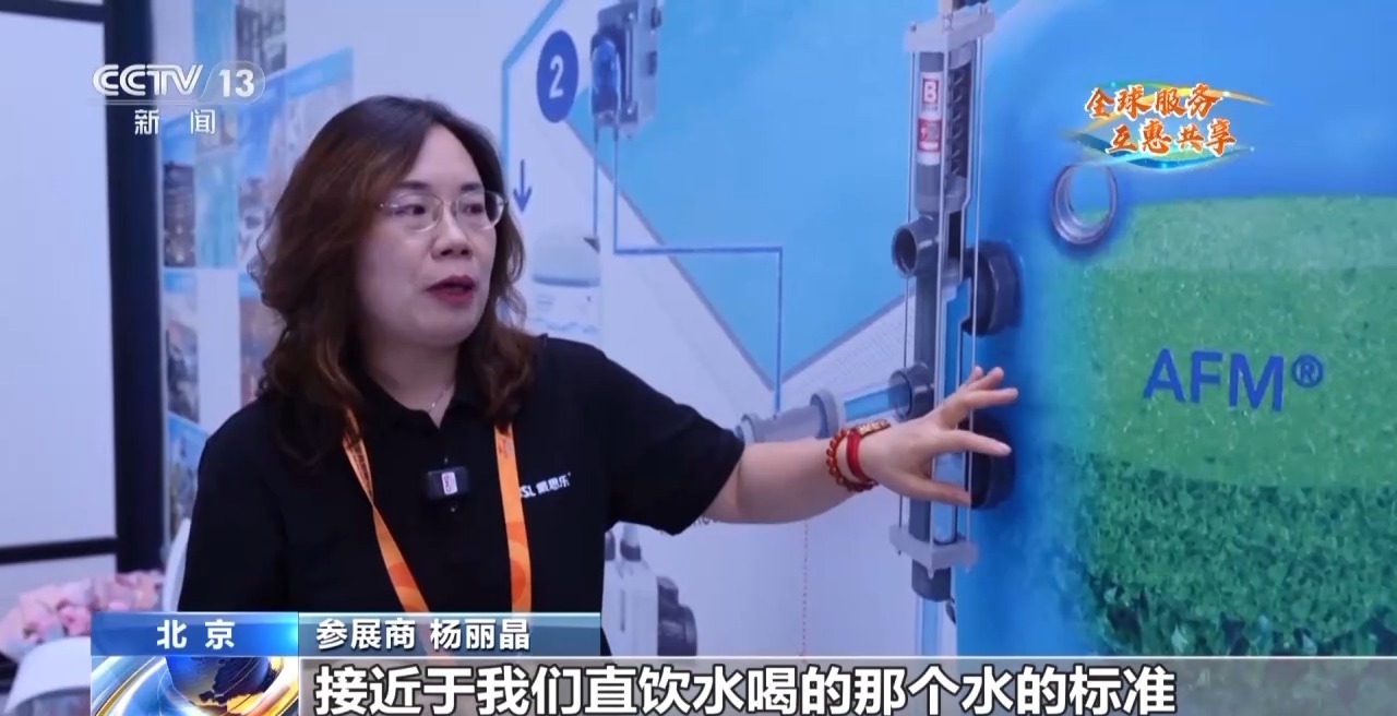参展商 杨丽晶:这里面用了一个核心的技术叫作AFM,一种活性滤料,通过这种滤料可以让水的过滤精度达到微米,接近于直饮水的标准。今年全运会的游泳池、跳水池和训练池,都是用的这套低氯的系统。