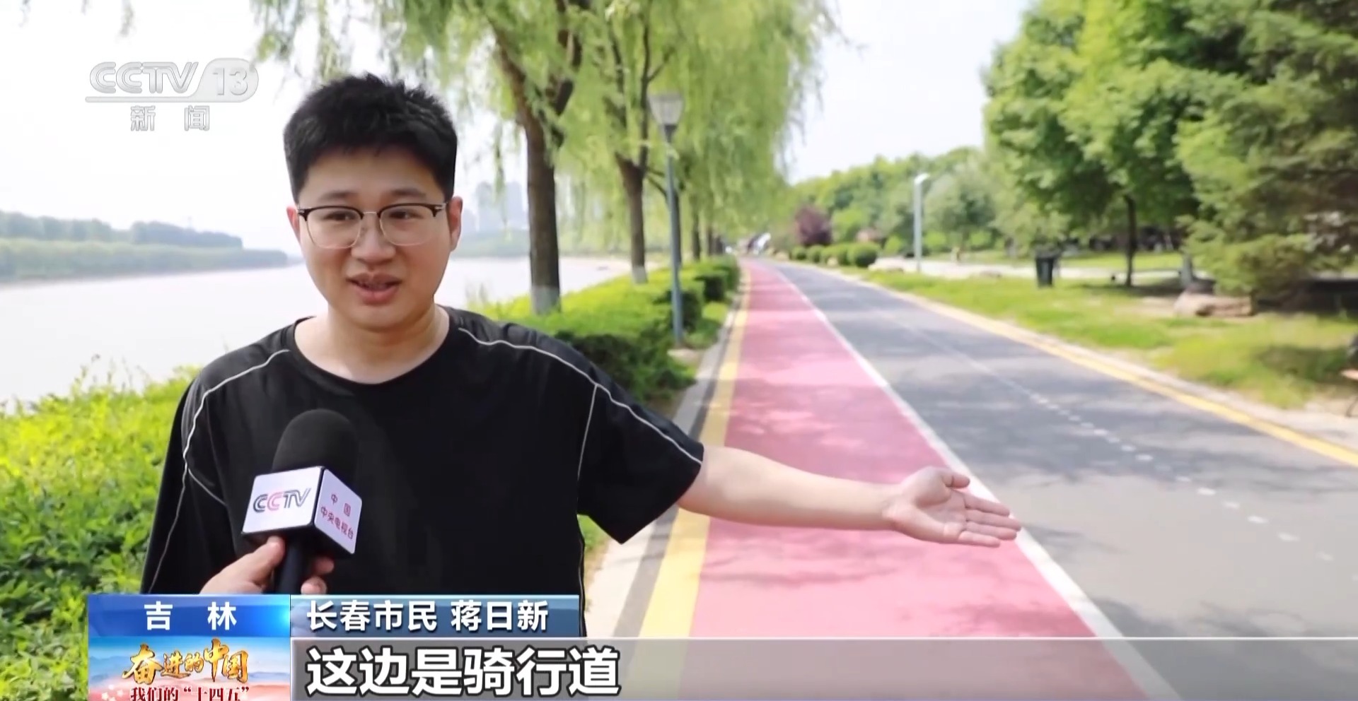 长春市民 蒋日新:以前这就像臭水沟一样,现在负氧离子特别高,红色的是跑步道,这边是骑行道,在这边骑行非常的凉快儿。