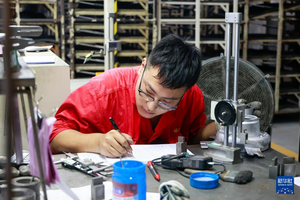 9月16日,工作人员在江苏无锡滨湖区无锡锡南科技股份有限公司的生产车间进行砂芯制造。新华社记者 刘佳琪 摄