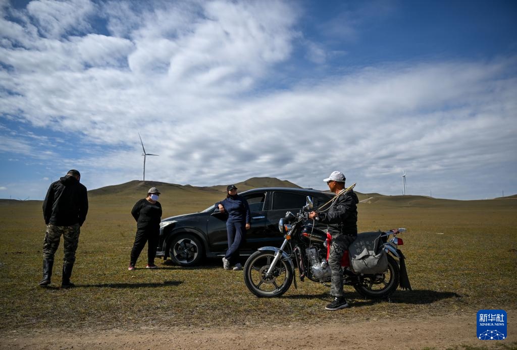 9月20日,都楞宝力高的妻子都冷苏布道(左三)在转场途中和邻居聊天。新华社记者 连振 摄