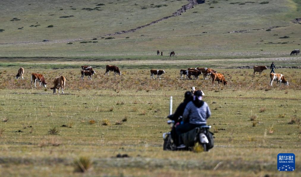 9月19日,都楞宝力高的妻子都冷苏布道骑摩托车赶牛(无人机照片)。新华社记者 连振 摄