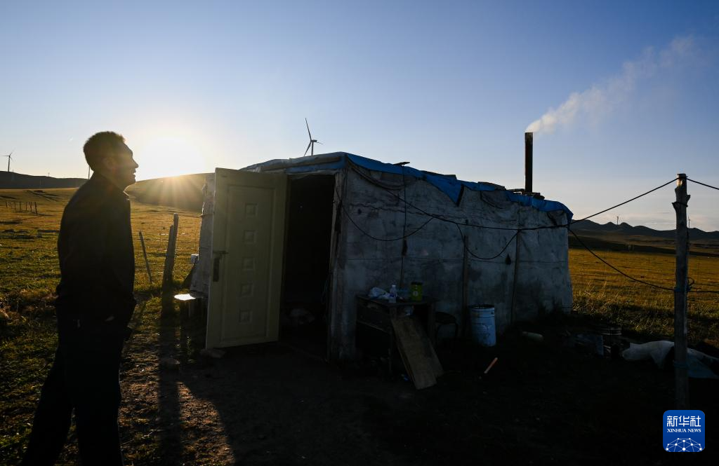 9月19日,在放牧点,都楞宝力高远眺邻居家的畜群。新华社记者 连振 摄